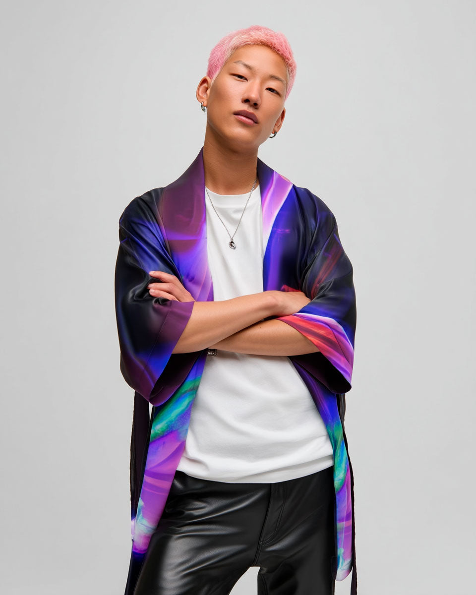 This Snake kimono is an invitation to embody elegance with a futuristic edge. Its fabric catches light while the artwork holds deeper intention.
